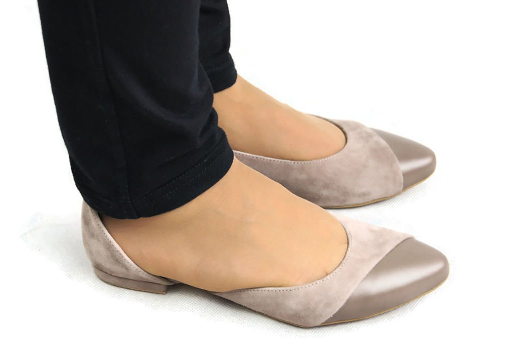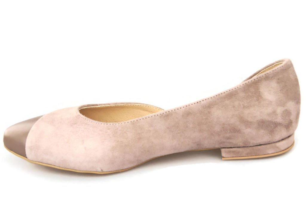 - Damen-Ballerinas aus hochwertigem Naturnarbenleder kombiniert mit Ziegenveloursleder .