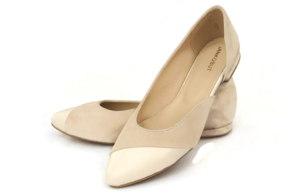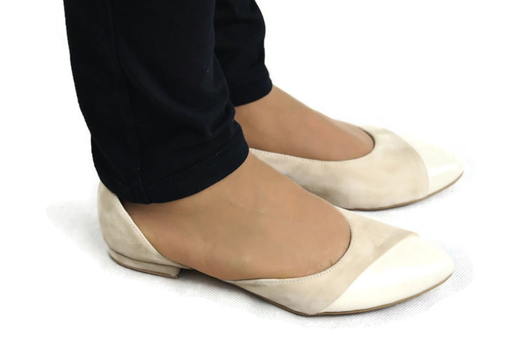 - Damen-Ballerinas aus hochwertigem Naturnarbenleder kombiniert mit Ziegenveloursleder .