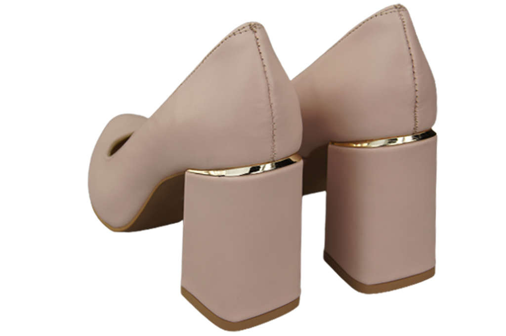 - Ein breiter lederbezogener Absatz mit goldenem Einsatz vervollständigt den Look.